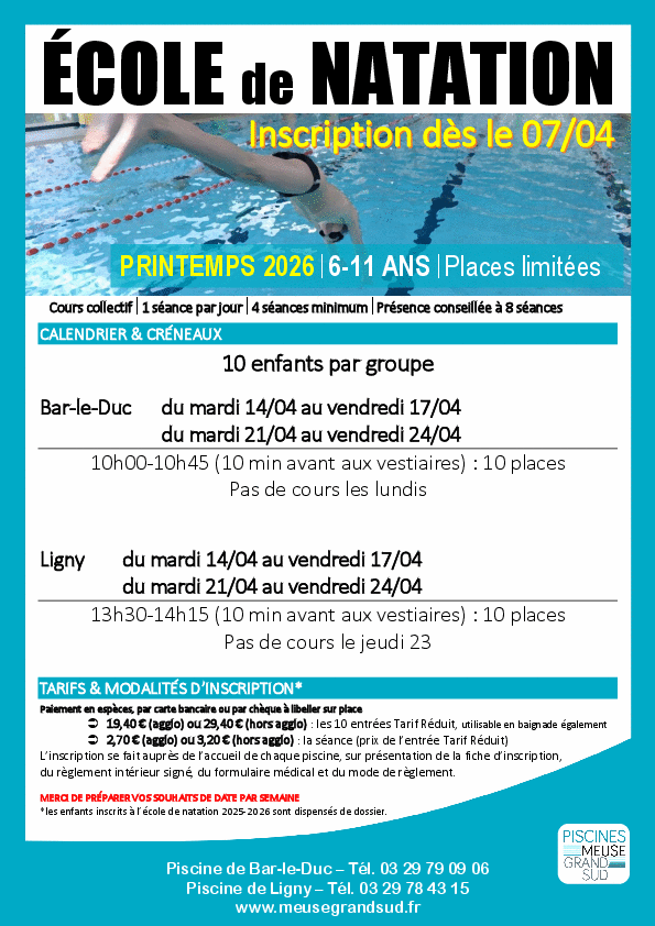 Rendez-vous directement à l’accueil de votre piscine pour inscrire votre petit nageur. Toutes les infos et modalités sur notre site : www.meusegrandsud.fr.